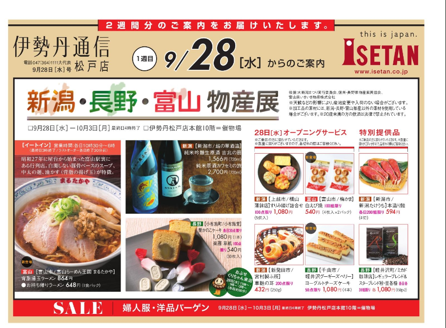 9月28日から10月3日の6日間、千葉県の伊勢丹 松戸店で物産展が開催されます!